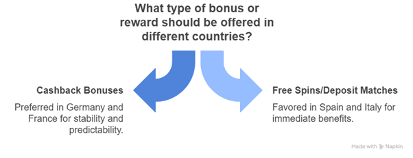 - In Germany and France, cashback bonuses are predominant, which return a percentage of lost funds to players. This type of reward is stable and predictable, appealing to players who value reliability.