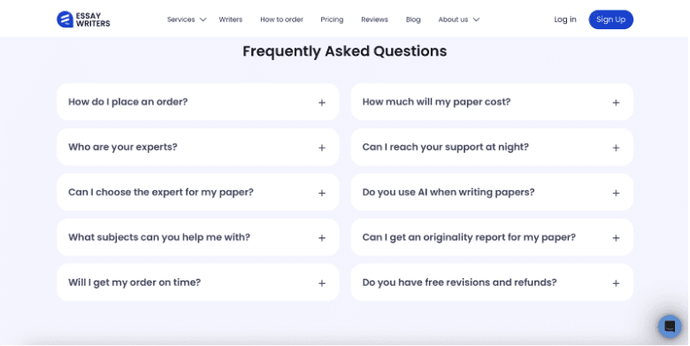 Additionally, the platform features an extensive FAQ section. If it’s your first time with EssayWriters, the straightforward answers to common questions will help you learn more about the service and how to use it.
