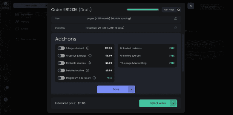 You can also include some add-ons if necessary. And, most importantly, you can enjoy extras that come at no extra charge. These include unlimited revisions, plagiarism report, title page, formatting, and unlimited sources. There are also bulk discounts that apply automatically. If you order 2+ pages, you can save from 5% to 40%.