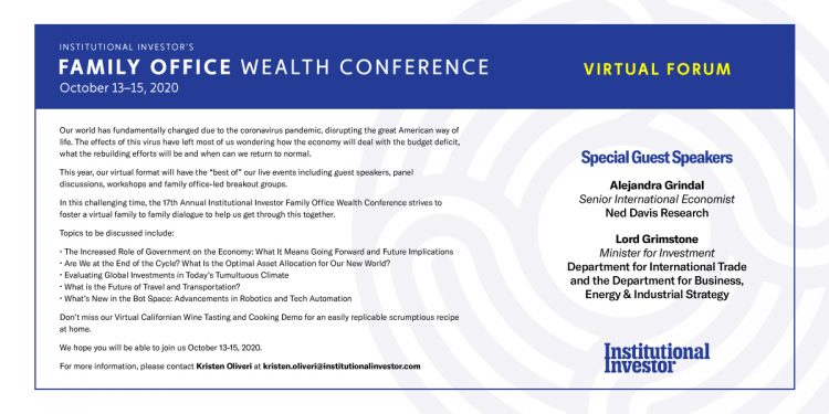 In this challenging time, the 17th Annual Institutional Investor Family Office Wealth Conference strives to foster a virtual family to family dialogue to help us get through this together. Thought leaders and industry peers will come together on October 13-15, 2020.