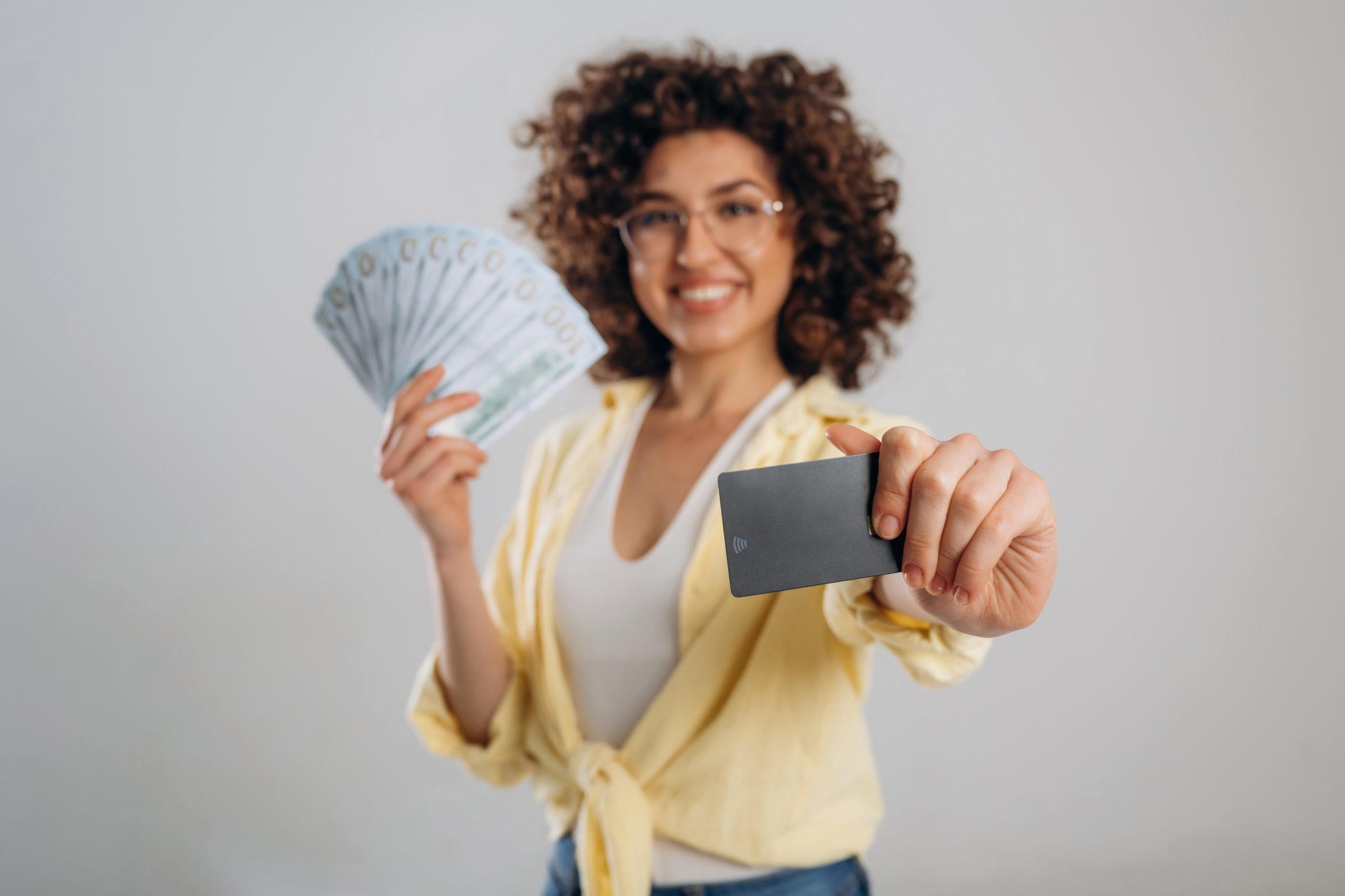 Lot of money and credit card in hands. Beautiful woman is in the studio.