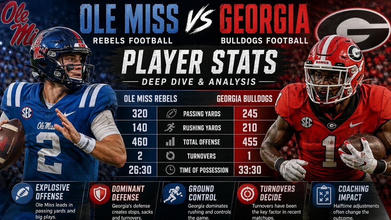 Georgia plays a controlled and disciplined brand of football every single game. Ole Miss brings speed, creativity, and an aggressive offensive style to every matchup. Understanding both styles through Ole Miss Rebels Football vs Georgia Bulldogs Football Match Player Stats helps fans follow the game better. This deep analysis covers every important area of the game in detail.