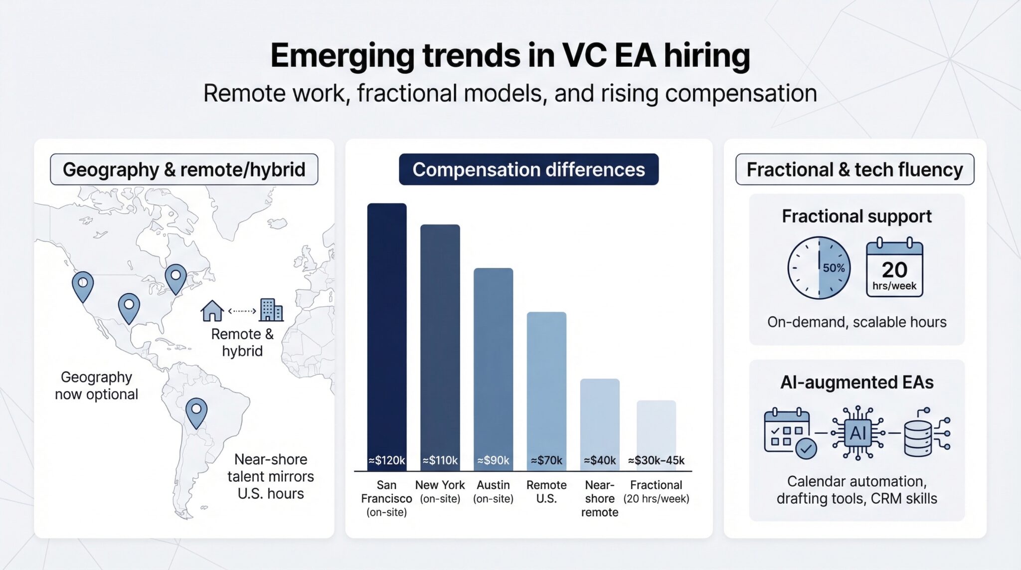 Compensation keeps climbing. In San Francisco or New York, seasoned venture EAs routinely earn six-figure base pay. Austin averages closer to ninety thousand, while premium near-shore remote support lands nearer forty thousand. The cost gap explains why smaller funds embrace hybrid models: they keep quality high while stretching budget.