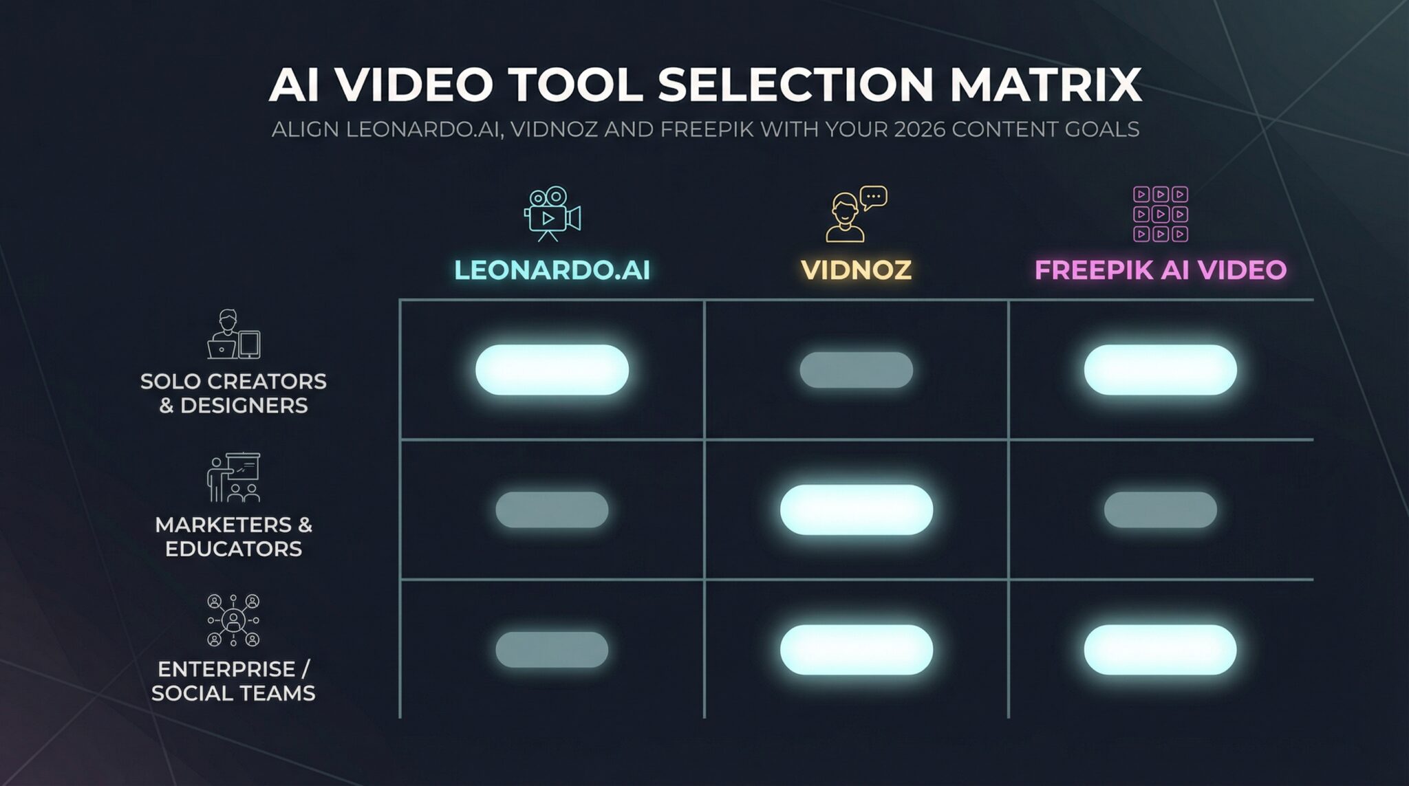 | Criterion | Leonardo.ai | Vidnoz | Freepik AI video |