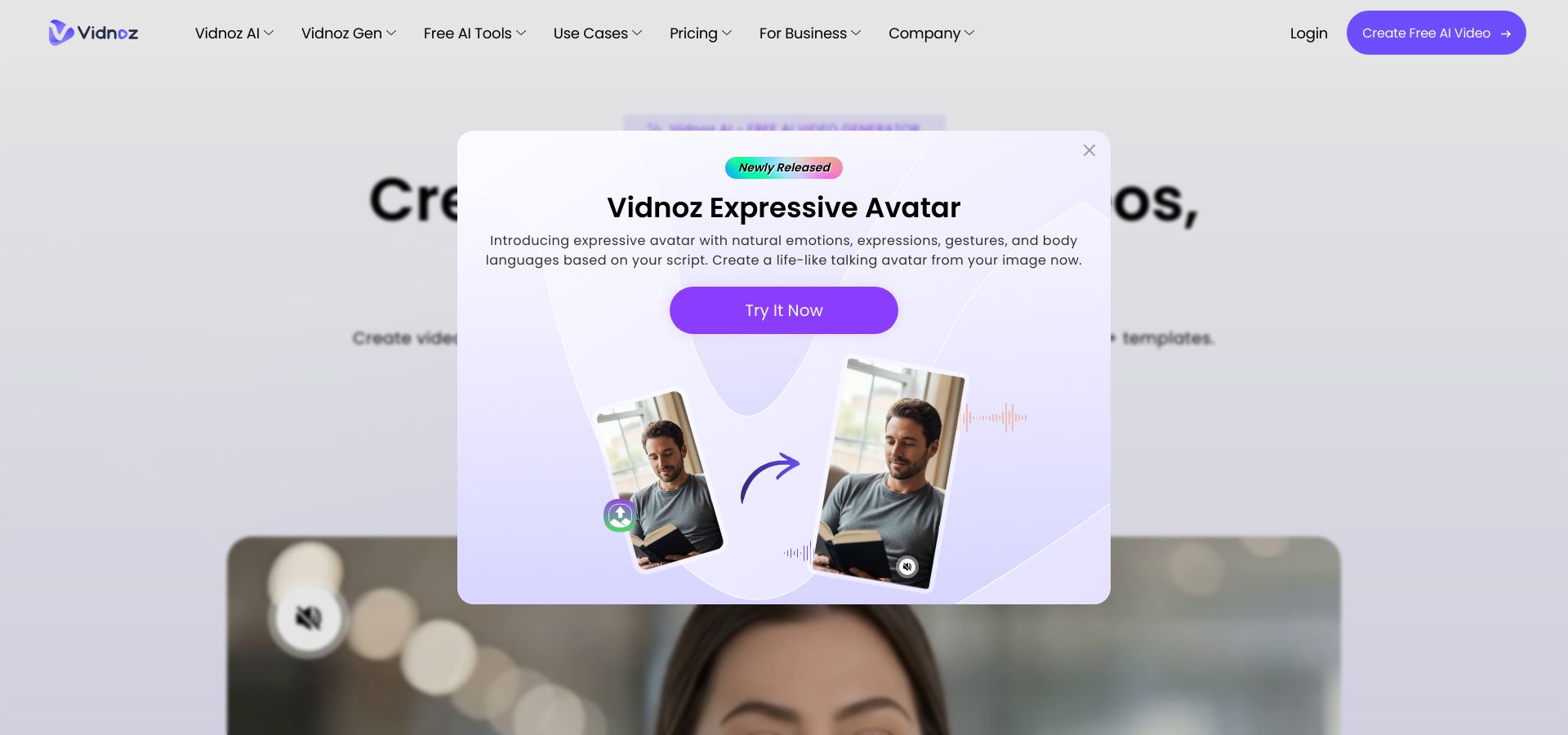 Vidnoz AI Video Generator Homepage Screenshot for Avatar Videos