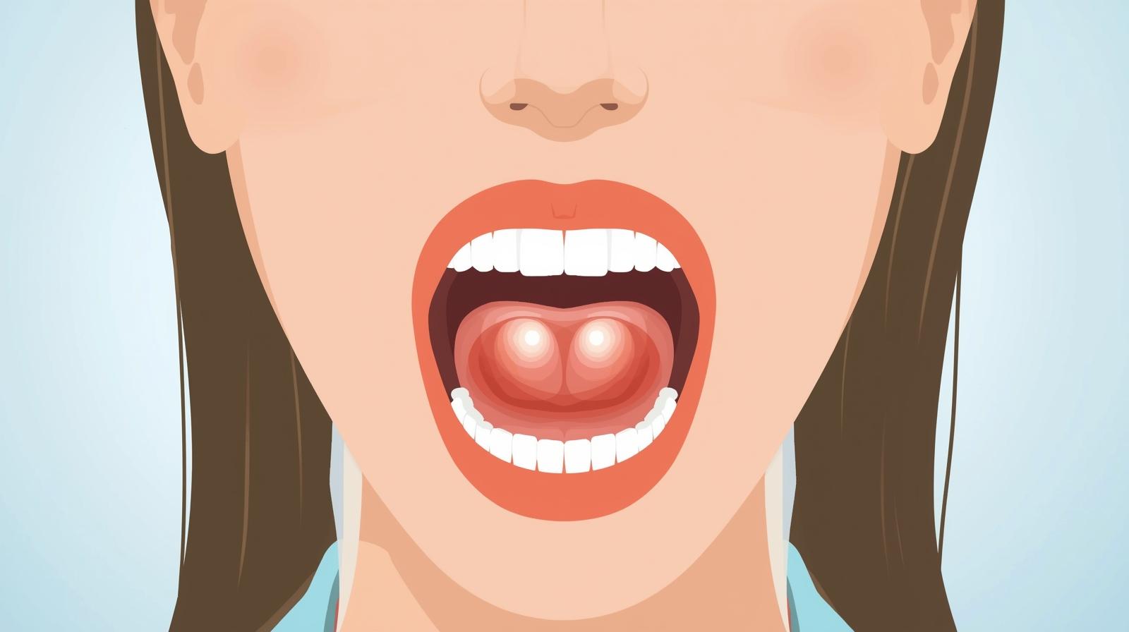 • White or yellowish lumps visible on the tonsils