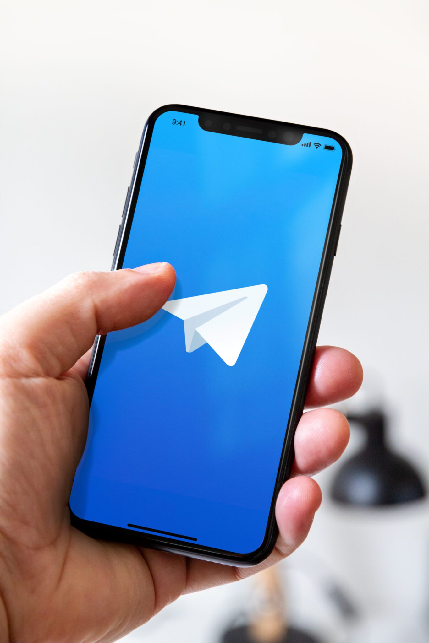 Paris - France - March 23, 2021 : Hand holding iphone smartphone with Telegram logo